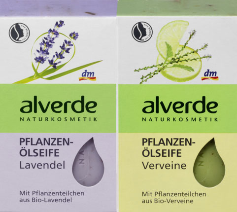 Direttamente dall’haul di Alverde (qua e )… purtroppo non posso farvi vedere le scatoline vere perché hanno fatto una brutta fine durante il viaggio di ritorno (sono state uccise da un mix di tonico alle Alghe Marine e di balsamo riparatore all’Avocado e Burro di Karitè). Hanno praticamente lo stesso INCI, cambiano ovviamente gli estratti ed i coloranti anche perché una saponetta è viola, mentre l’altra è di un giallo-verdolino. Sono buone entrambe, ma la mia preferita è quella alla Verbena… dal profumo fresco e frizzante. Hanno dei piccolissimi pezzettini che fanno una specie di scrub molto blando… oserei dire quasi inesistente!