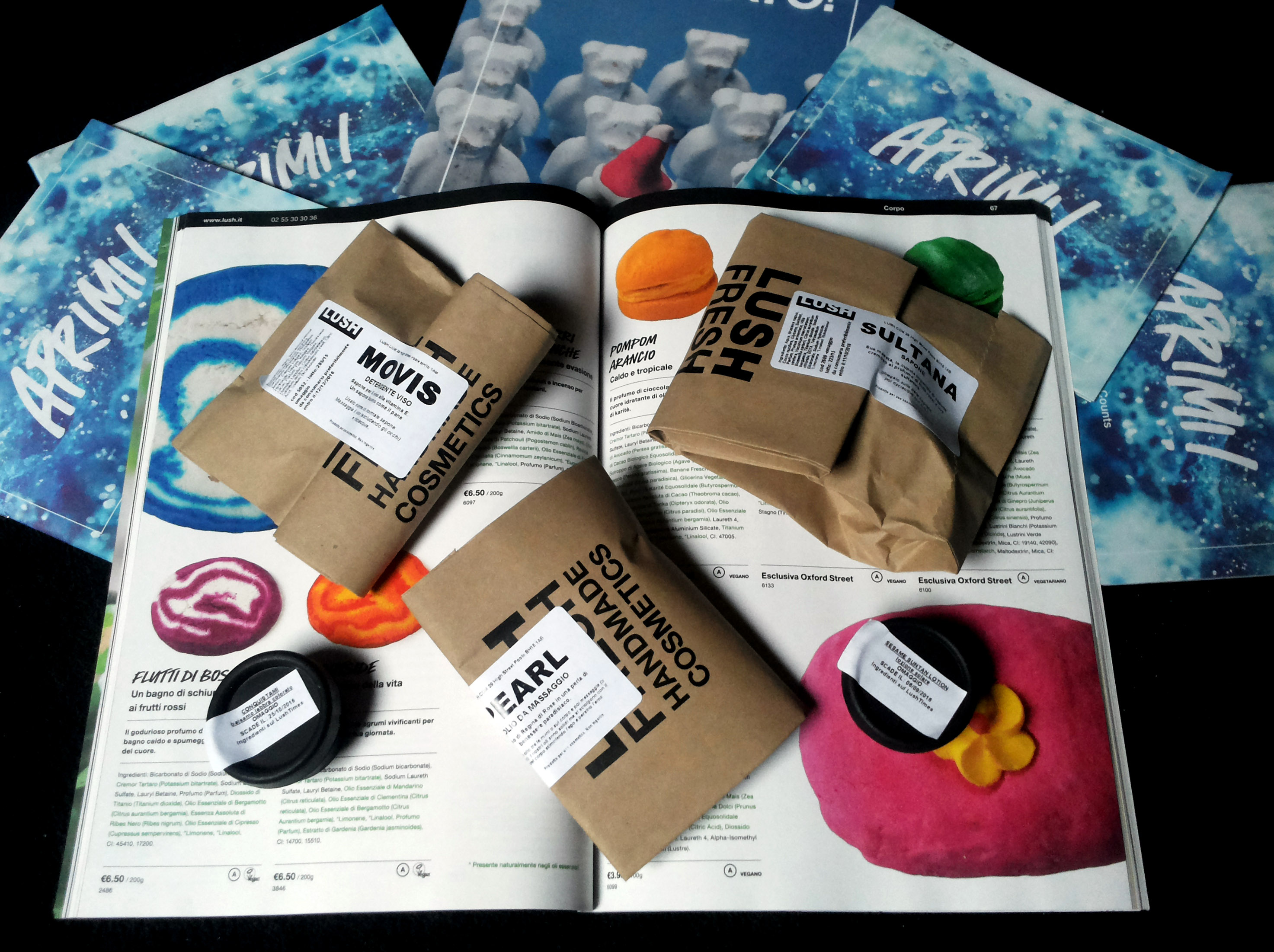 Ho fatto un mega ordine il 5/01 e, dopo soli tre giorni, è arrivato il tutto in un scatolone ben protetto da cornettini verdolini e morbidosi. Mi hanno inviato in omaggio anche diversi campioncini ed alcuni cataloghi tra cui il Lush Time, dove sono riportate tutte le informazioni relative ai diversi prodotti. In tutto ho speso 63,18 € più 2,99 € per le spese di spedizione.