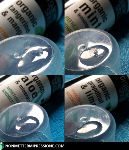 Sono conservati in comodi flaconi dotati di pratici erogatori a pompetta “open&closed” che consentono di dosare la giusta quantità di prodotto senza inutili sprechi. Hanno tutti una consistenza “gellosa” e profumi differenti che cercherò, nelle mie modeste possibilità, di descrivere qua sotto ↓: