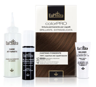 I Laboratori di ricerca Euphidra hanno creato colorPRO, una innovativa formula senza ammoniaca e priva di alcuni dei più diffusi allergeni. Copre perfettamente i capelli bianchi rispettando il cuoio capelluto, anche delicato. Il sistema di colorazione tono su tono penetra nel capello liberando nuances naturali ed intense. Le Proteine della Seta avvolgono e proteggono ogni singola fibra capillare per un risultato brillante e riparatore.