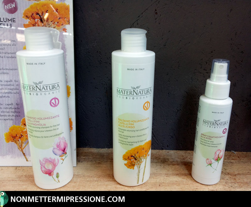MaterNatura ha aggiunto tre referenze alla linea dedicata alla cura dei capelli: lo Shampoo Volumizzante per Capelli Fini alla Magnolia, il Balsamo Volumizzante per Capelli Fini all’Elicriso e lo Spray Fissativo per Capelli alla Rosa.