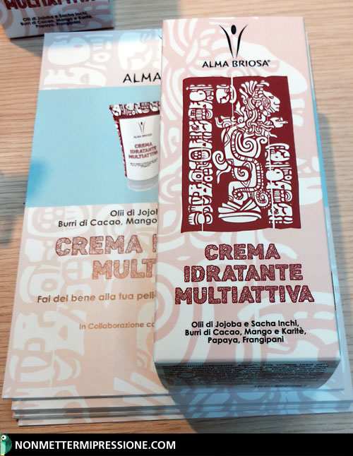 Ampiamente conosciuta per le meravigliose FitoPomate, Alma Briosa – in questo SANA 2017 – ha presentato la Crema Idratante Multiattiva, un prodotto multiuso (adatto per viso, corpo, mani e piedi) che ben si presta all’idratazione di tutti i tipi di pelle e che contiene un pot-pourri di pregiati ingredienti vegetali (Olio di Jojoba, Olio di Sacha Inchi, Estratto di Papaya, Burro di Cacao, Karitè e Mango) tipici della cultura erboristica del Sud America. Non è finita qui; or ne viene il bello: parte del ricavato delle vendite di questa crema, nata dalla collaborazione con Fratelli dell’Uomo  (un’organizzazione non governativa, o ONG, nata nel 1969 con l’intento di migliorare le condizioni di vita delle popolazioni del Sud del Mondo), andrà devoluto in beneficenza al progetto “Piante Medicinali che combattono la povertà”, volto a migliorare le condizioni di vita di una piccola comunità di donne Maya K’iches in Guatemala.