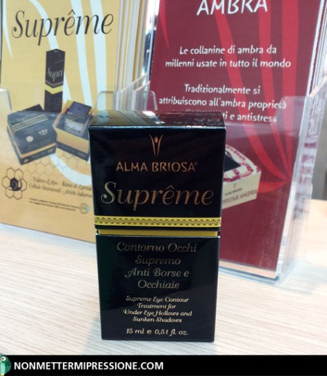 Alma Briosa ha deciso, inoltre, di accrescere la linea “Suprême”, una piccola gamma di prodotto cosmetici dedicata alla cura del viso e realizzata con materie prime naturali dal portentoso potere antirughe (Veleno d’Ape, Bava di Lumaca, Cellule Staminali Vegetali di Vite e Acido Ialuronico), aggiungendo il Contorno Occhi Supremo Anti Borse e Occhiaie.