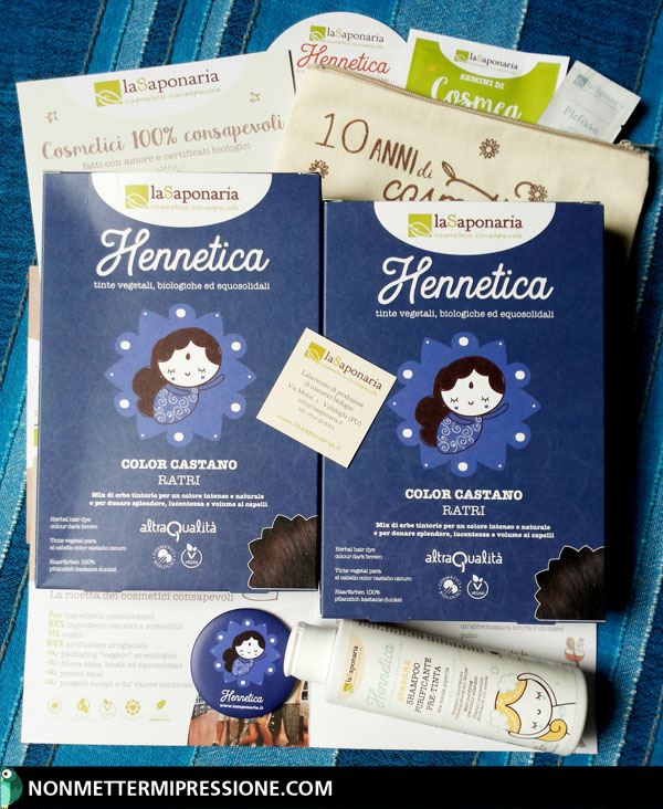 Allo shop ho acquistato due confezioni di Tinta Vegetale Castano Scuro “Ratri” e lo Shampoo Purificante Pre-Tinta “Avatara”, entrami della linea “Hennetica”. Per finire, ho ricevuto in omaggio uno specchietto in tinta con la tinta e una graziosa pochettina contente una bustina di semini di Cosmea e un campioncino di Latte Stuccante “Melissa” della nuova “Linea Viso Costituzionale”.