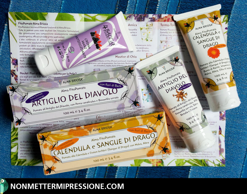 Devo essere sincera, di Alma Briosa non avevo mai provato nulla, poi – un giorno – mi sono imbattuta in un video realizzato da Cristina del canale youtube “Cristina BioBellezza” in cui parlava di alcuni cosmetici realizzati da quest’azienda. Così, incuriosita, sono andata a spulciare sul loro sito segnadomi tutti quei prodotti che avrei voluto provare e che effettivamente, poi, ho deciso di acquistare al loro stand durante il SANA, ossia la FitoPomata Calendula e Sangue di Drago, ottima per accudire le mie povere mani martoriate, e quella Artiglio del Diavolo, perfetta per mitigare i miei frequenti mal di schiena.