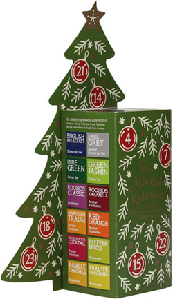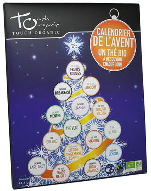 Scopri 24 bustine di tè con 15 sapori tradizionali, esotici e vari che daranno gioia a tutti gli amanti del tè. Touch Organic propone un calendario dell’Avvento con tè provenienti da agricoltura biologica e commercio equo e solidale. Sono certificati biologici da Ecocert e FairTrade.