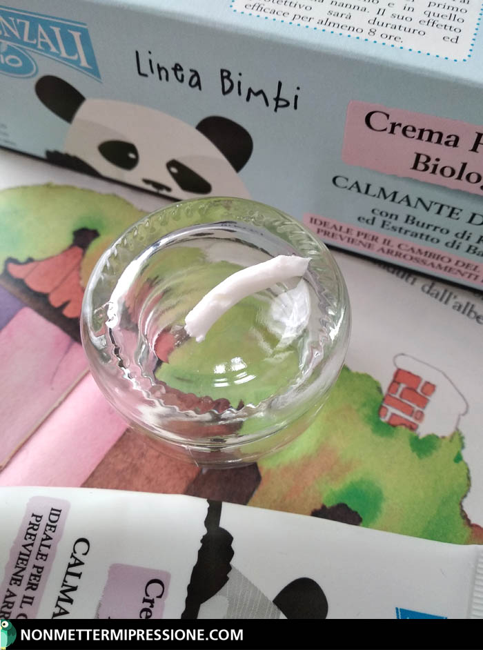 Questa cremina, trovata in super-offerta nel reparto “bimbi” del mio Interspar di fiducia, è conservata in un piccolo tubetto di plastica morbida con tappo a scatto ed è accompagnata dalla classica confezione in cartone che, oltre a riportare tutte le informazioni relative al prodotto (descrizione, formulazione, certificazione varie ed eventuali), racchiude un piccolo foglietto illustrativo dedicato all’intera linea.