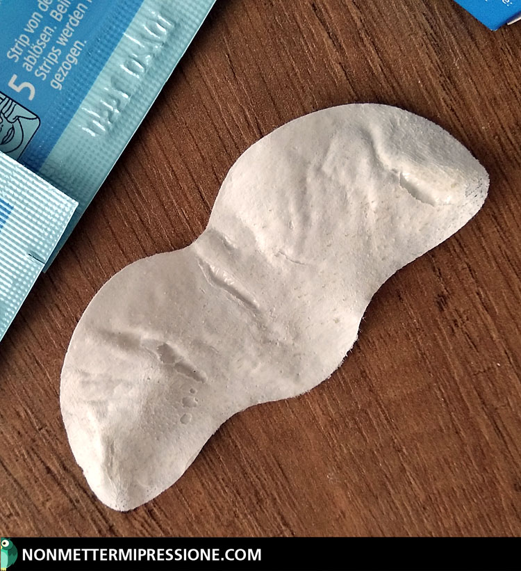 Inoltre, guardando l’immagine in alto a destra sulla confezione di cartone, ho scoperto che possono essere utilizzati anche per le altre parti della zona T per cui, rigirandone il verso, ho voluto provare ad applicarli sul mento (altro sito pullulante di inimmaginabili “orrori neri”) e, come per il naso, ho notato lo stesso soddisfacente livello di pulizia.