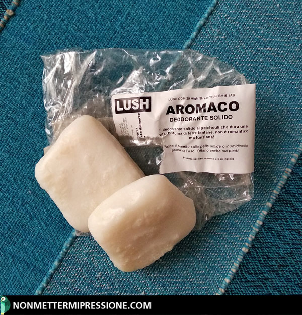 - Deodorante solido “Aromaco” – Lush (100 g a 7,25 €).