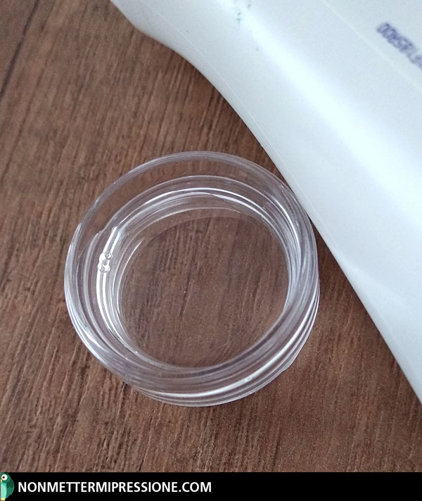 Per risolvere il problema ho deciso, semplicemente, di travasare il contenuto in un modesto flacone dotato di un pratico dosatore a pompetta. Inoltre, in seguito all’accurato travaso, sono stata costretta a squartare la confezione per andare a prelevare il bordello di prodotto rimasto all’interno.