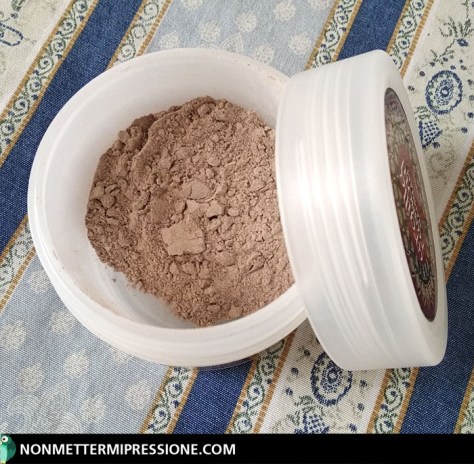 Se mia sorella dovesse, malauguratamente, leggere questo post, con ogni probabilità mi prenderebbe a legnate perpetue dal momento che questa argilla mi è stata regalata – per l’appunto – da lei eoni fa. Considerazioni inutili a parte, non ho visto particolari cambiamenti organolettici per cui continuerò ad utilizzarla mettendoci un po’ più di rapidità. Come avrete sicuramente notato dalla foto, il prodotto in polvere è conservato all’interno di un barattolo in plastica rigida dotato di un semplice tappo a vite – sempre in plastica rigida – e ulteriormente preservato da un aggiuntivo dischetto protettivo di plastica.