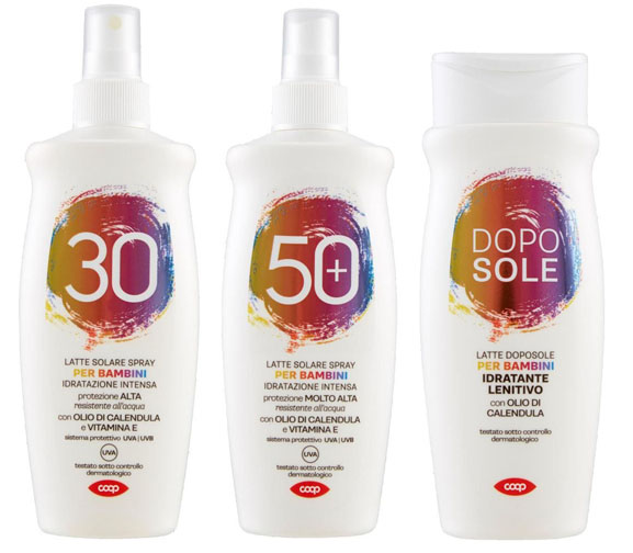 - Latte Solare Spray per BAMBINI “Idratazione Intensa” – Protezione MOLTO ALTA 50+, formula resistente all’acqua ed arricchita con olio di Calendula e Vitamina E (200 ml a 10,90 €).