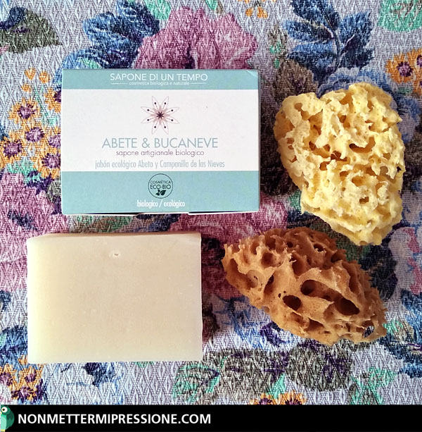 Se ben ricordo, “Sapone di un Tempo” dovrebbe avere tre linee dedicate ai saponi solidi, ossia quella classica naturale, quella di Aleppo e quella biologica ed è proprio da quest’ultima che ho deciso di attingere scegliendo, tra le diverse varianti proposte, la versione “Abete e Bucaneve”.