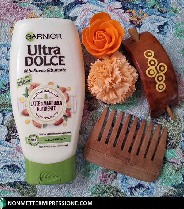 Ho deciso di acquistare questo prodotto perché attirata non solo dalla presenza della mandorla, ma anche dal prezzo, dalla formula accettabile e dalla lettura di alcune recensioni positive. Come tutti i balsami della “Ultra Dolce” anche questo è conservato all’interno di un flacone realizzato con una plastica sufficientemente morbida per facilitare la fuoriuscita del prodotto e accompagnato dalla presenza del solito tappo a scatto. Ha una bella consistenza cremosa e un piacevole profumo in cui è possibile percepire l’odore della mandorla contornato, però, da una sorta di sentore dolciastro e da alcune sfumature che ricordano la profumazione di quello all’Olio di Avocado & Burro di Karitè.