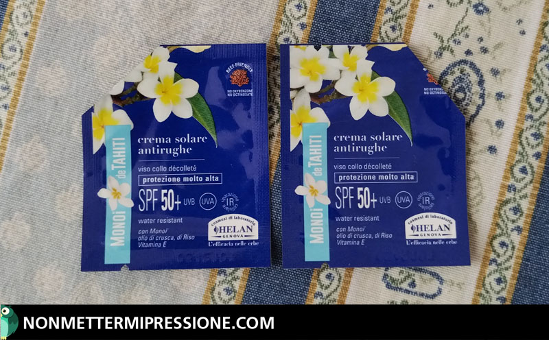⇒ Crema solare antirughe SPF 50+ della linea “Monoi de Tahiti” – Helan (2 x ml scappati di casa).